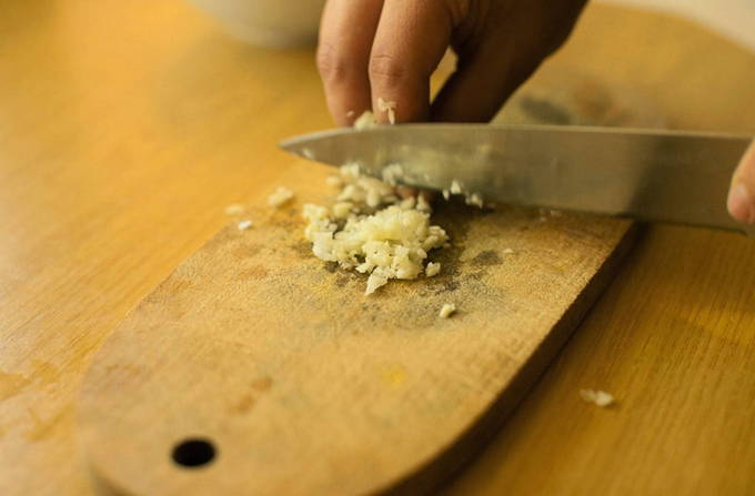 - Pel de knoflook en hak deze fijn met een mes.