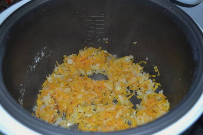 - Smeer de multicooker-kom met plantaardige olie, leg de uien, wortels en vlees neer. We zetten de "Fry" -modus aan en bakken, roeren gedurende 15 minuten.