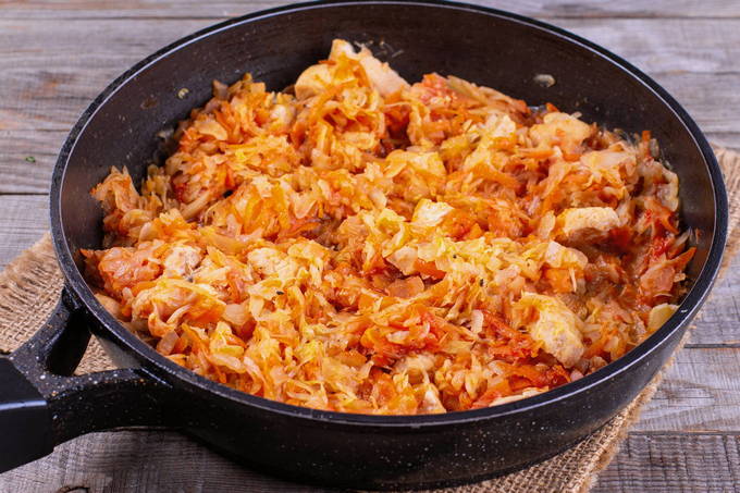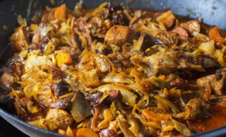 - Voeg nu kool, stukjes worst, tomatenpuree, water, zout en peper naar smaak toe aan de groenten. Bedek de pan met een deksel en laat ongeveer een uur sudderen, tot de kool zacht is.