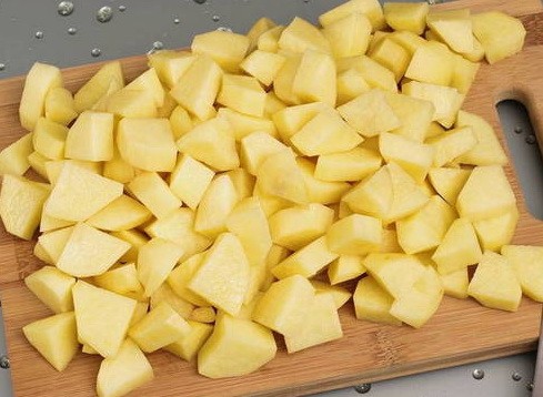 - Schil, was en snijd de aardappelen in middelgrote stukken van elke vorm.