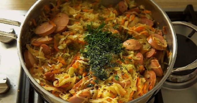Stap-voor-stap recept voor het maken van verse kool bigus met worst