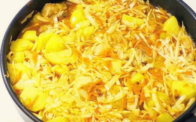 - Voeg aardappelen, kool, tomatenpuree, water, plantaardige olie, zout en peper toe aan de pan. Dek af en laat 1,5 uur sudderen.