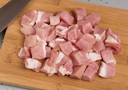 We wassen het varkensvlees, reinigen het vlees van witte strepen en snijden het in kleine blokjes.