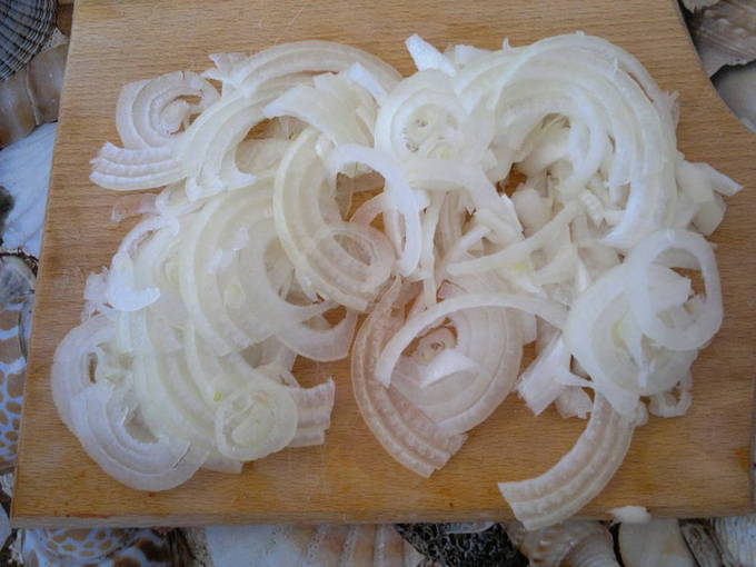 We maken de ui van de schil schoon, snijden hem in halve ringen.