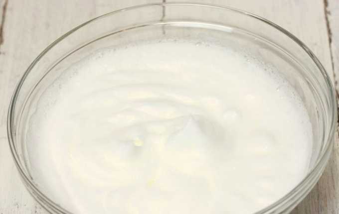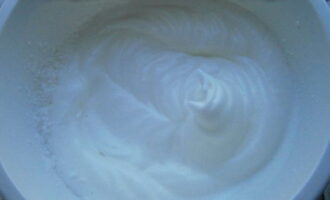 - Klop de eiwitten afzonderlijk samen met de resterende suiker met een mixer op hoge snelheid tot een dicht schuim met stabiele pieken.