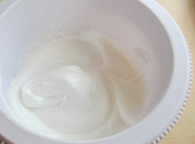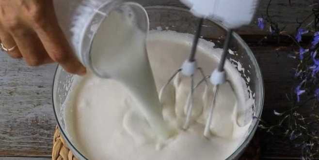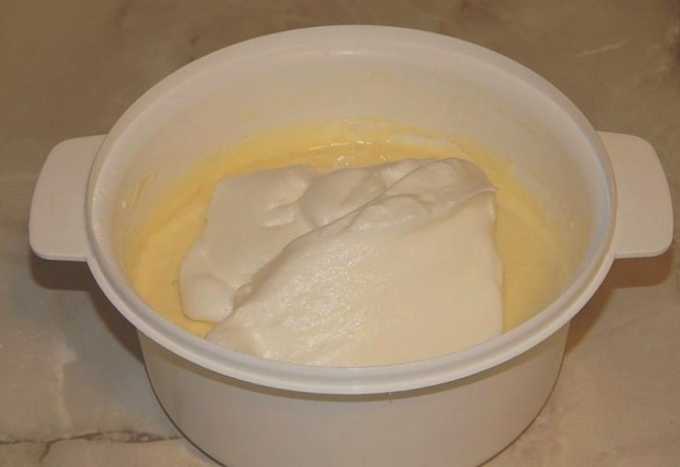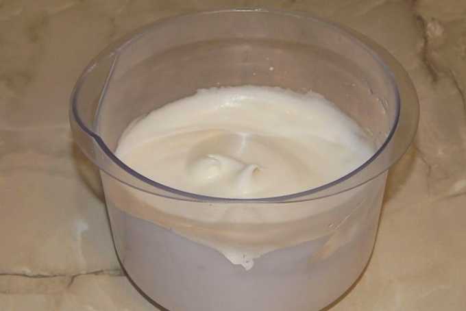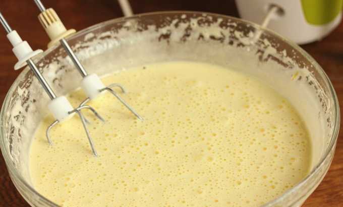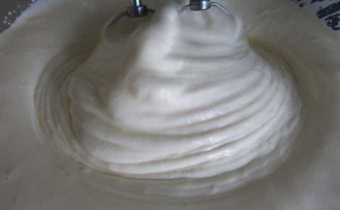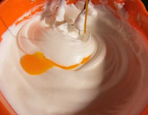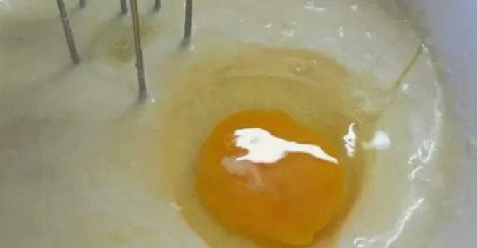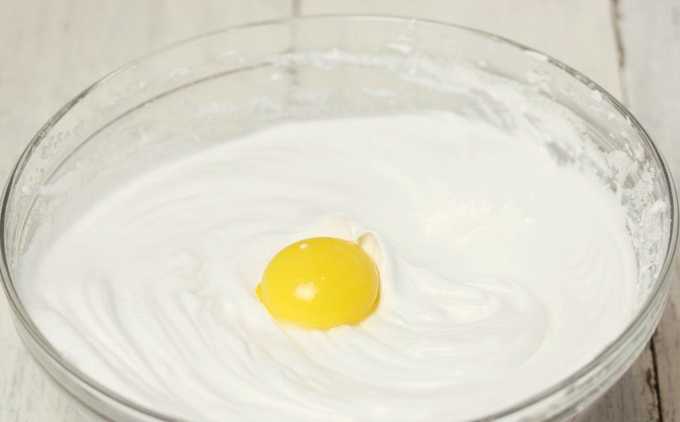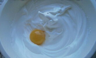 - Voeg vervolgens een dooier toe aan het eiwitschuim en blijf werken met een mixer. Na de introductie van de dooiers moet de massa nog steeds licht blijven, met een lichtbeige tint en weelderig.