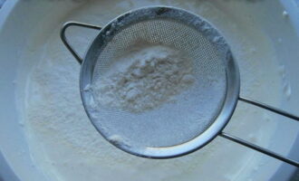 - Zeef de bloem door een fijne zeef samen met bakpoeder en voeg toe aan de losgeklopte eimassa.Kneed het deeg langzaam, in een cirkelvormige beweging, met een spatel of lepel en til de onderste laag op. Het is belangrijk om de gevormde luchtbellen tijdens het kloppen in het deeg te houden, maar tegelijkertijd alle bloemklonten te breken.