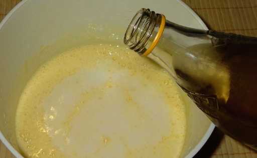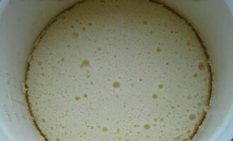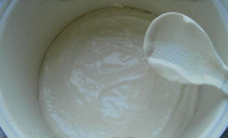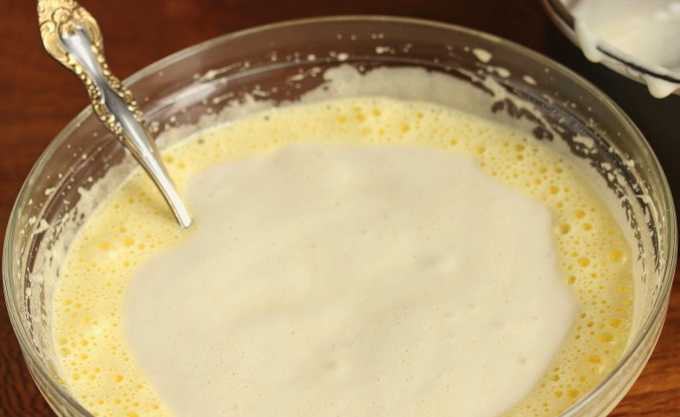 - Giet kefir in de eiermassa, meng tot een gladde massa.