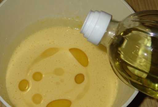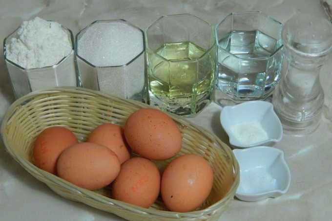 - We bereiden producten voor het deeg. We meten de benodigde hoeveelheid kristalsuiker, water en plantaardige olie af. Eieren voor het deeg moeten goed gekoeld zijn.