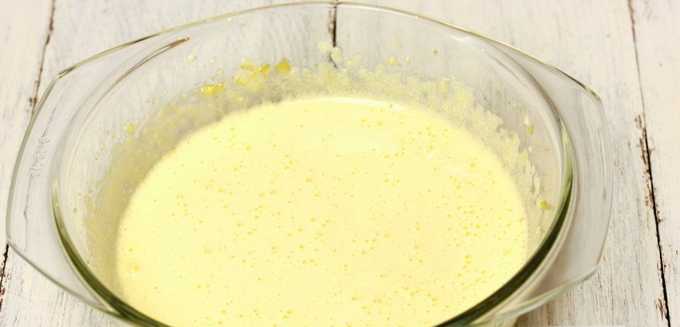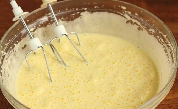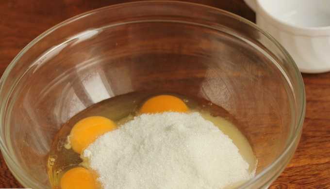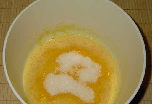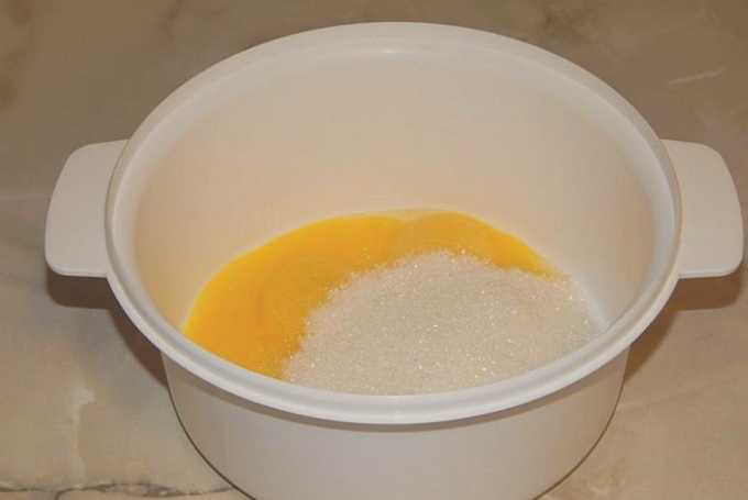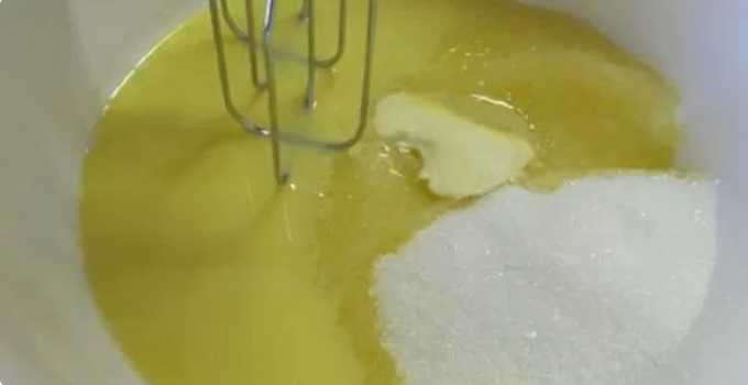 - We breken de eieren in een grote kom, waarin we het deeg kneden. Giet er kristalsuiker in, giet er gesmolten boter in. Begin te kloppen met een mixer op lage snelheid. We bereiken het mengen van ingrediënten en het oplossen van suikerkorrels.