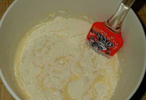 - Voeg de gezeefde bloem samen met het bakpoeder toe aan de dooiermassa en kneed voorzichtig met een spatel.