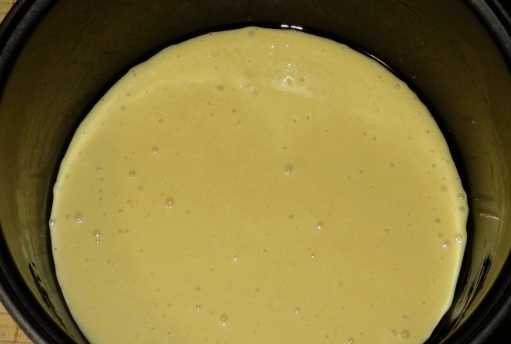 - We smeren de binnenwanden van de multicooker-kom met een dunne laag plantaardige olie met behulp van een siliconenborstel. We verspreiden het voorbereide deeg, egaliseren het oppervlak.