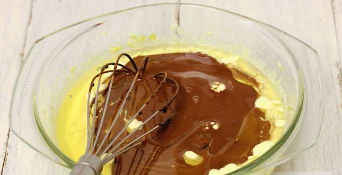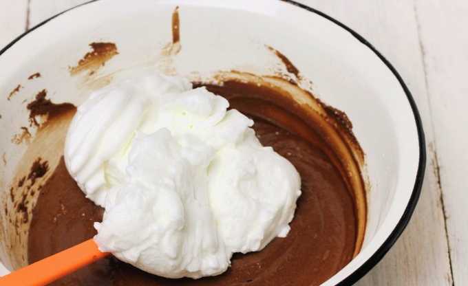 - We brengen een derde van de opgeklopte eiwitten in het chocoladedeeg en mengen ze voorzichtig tot de totale massa.