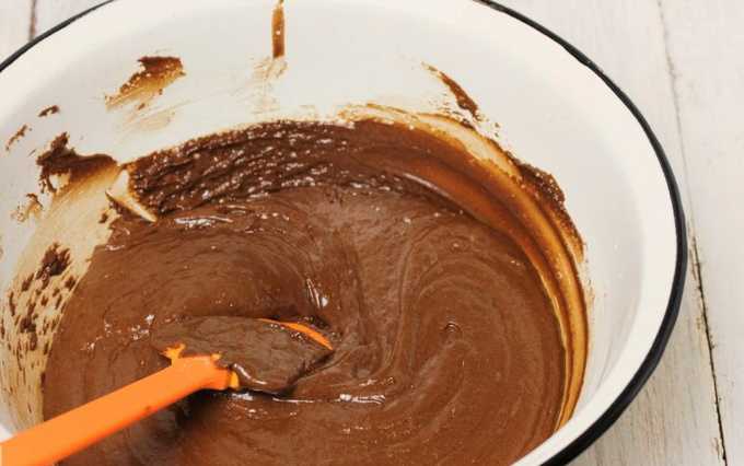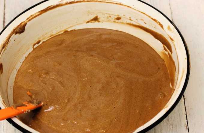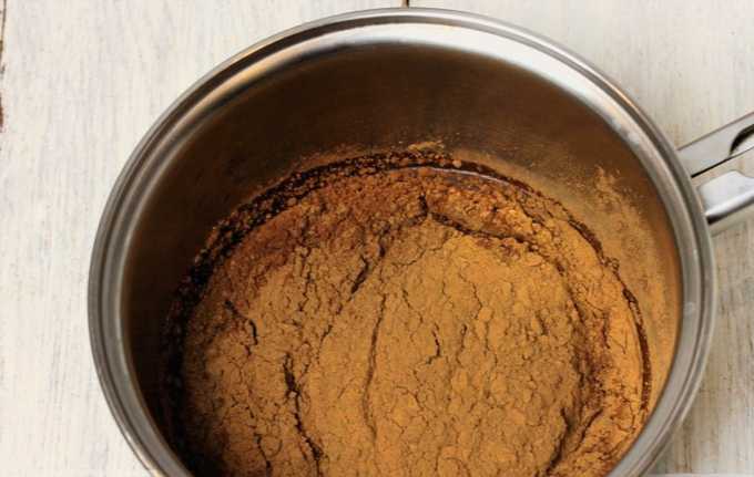 - Giet de aangegeven hoeveelheid water in een kleine pan, voeg cacaopoeder toe. We zetten de container op het vuur en brengen het mengsel al roerend aan de kook. Het blijkt een volledig homogene massa te zijn. Haal de kookpan van het vuur en laat de inhoud volledig afkoelen.