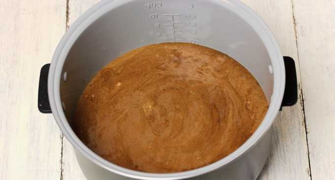 - We zetten de multicooker bijvoorbeeld aan in de modus "Bakken" - u hoeft alleen de kom op te warmen. Doe er boter in en smelt het tot een vloeibare toestand. De gesmolten boter zal verder gaan om het deeg te maken en de kom zal al ingevet zijn met vet voor het volgende bakken.