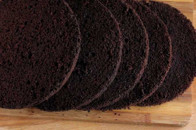 - Na zo'n lange afkoeling wordt het koekje stabieler, gestabiliseerd, het is handig om het met een voet in de vereiste hoeveelheid cakes te snijden. Omdat het product hoog blijkt te zijn, ongeveer negen centimeter, zijn er gemakkelijk vijf cakes te verkrijgen.