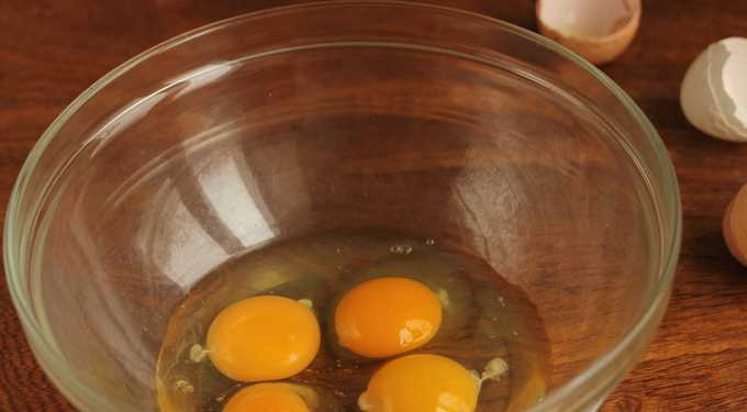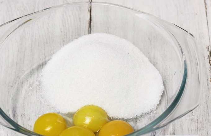 - Om het deeg te bereiden, breek je de eieren en scheid je het eiwit van de dooiers. We plaatsen de eiwitten in een aparte container en combineren de dooiers met 180 gram kristalsuiker in een kom. Houd er rekening mee dat we vier dooiers en zes eiwitten gebruiken om het deeg te bereiden.