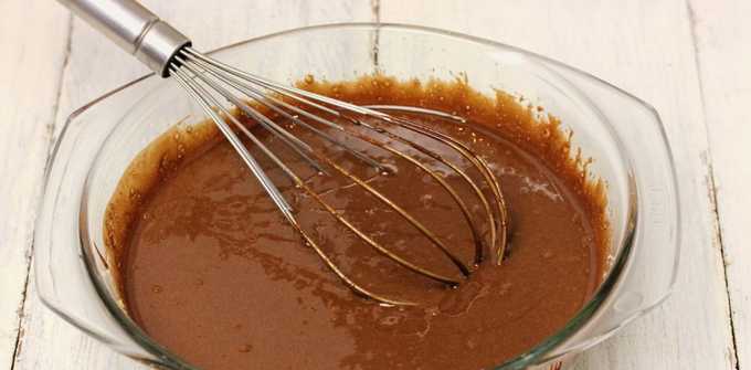 - Introduceer de afgekoelde vloeistof met cacao en geurloze plantaardige olie in de opgeklopte dooiers.