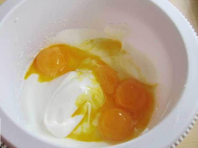 - Voeg vervolgens de dooiers toe en werk verder met een mixer.