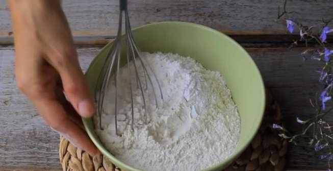 - Zeef de bloem door een fijne zeef samen met bakpoeder, zout en soda. Voeg het droge mengsel toe aan de kefir-eimassa. Kneed het deeg met een garde in een cirkelvormige beweging. We proberen de massa niet te laten bezinken en de luchtbellen gevormd tijdens het opkloppen er zoveel mogelijk in te houden. Tegelijkertijd is het belangrijk om alle bloemklonten te breken en uniformiteit te bereiken.