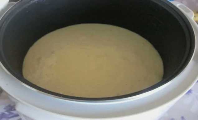 - We smeren de binnenwanden van de multicooker-kom met plantaardige olie met behulp van een siliconenborstel. We verspreiden het voorbereide deeg erin.