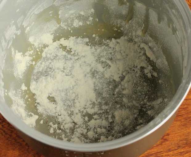 - Wanneer de massa homogeen wordt, giet er kokend water in en meng in dezelfde cirkelvormige beweging. Giet vervolgens geraffineerde plantaardige olie, meng.