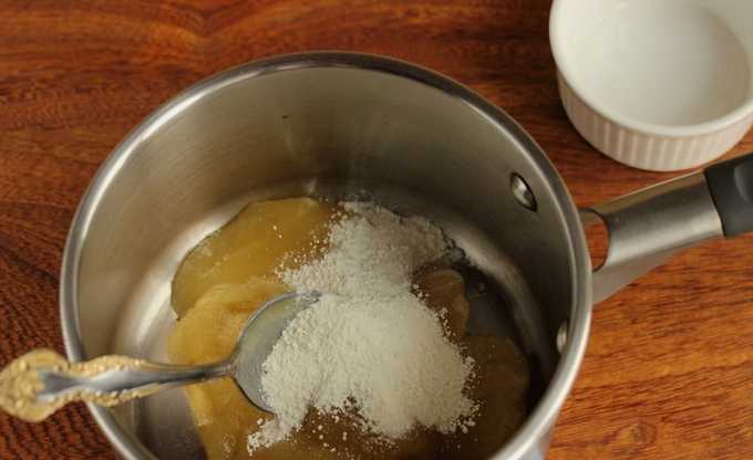 - Smelt honing tot vloeistof op het fornuis, onder voortdurend roeren. De massa wordt dik, homogeen en schuimig en neemt in volume toe. Als het mengsel helemaal wit is, haal je het van het fornuis.