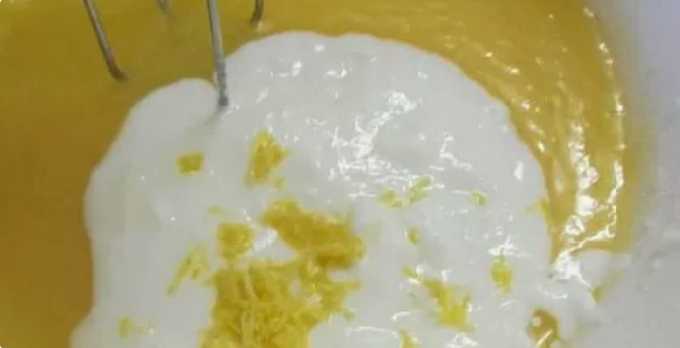 - Voeg zure room toe aan de resulterende massa. We wassen de citroen, drogen hem en verwijderen de schil met een speciaal apparaat of met een gewone fijne rasp. We overleven het sap - je hebt er een eetlepel van nodig. Giet de schil na de zure room in de eiermassa, giet het sap erbij. Zet de mixer weer aan en mix alles op middelhoge snelheid door elkaar.