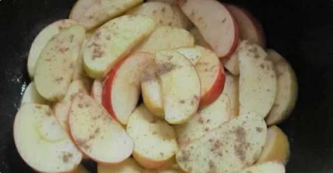 - Was de appels, droog ze en snijd ze in vieren. Knip de zaaddozen uit. Snijd vervolgens de kwarten in dunne plakjes.We doen de helft van het totale aantal plakjes in de reeds geoliede multicookerkom. Bestrooi met kaneelpoeder.
