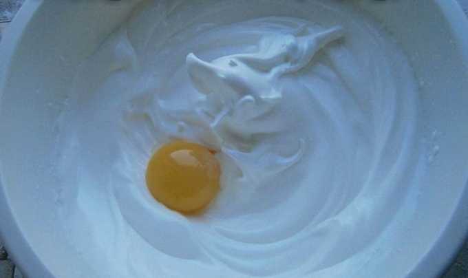 - Voeg vervolgens een dooier toe aan het eiwitschuim en blijf werken met een mixer. Na de introductie van de dooiers moet de massa nog steeds licht blijven, met een lichtbeige tint en weelderig.
