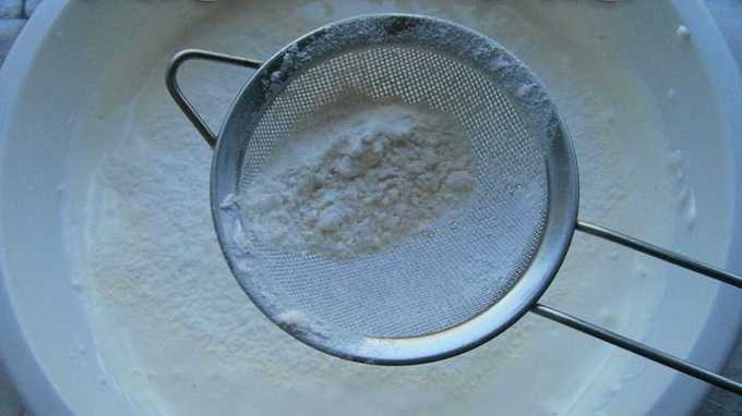 - Zeef de bloem door een fijne zeef samen met bakpoeder en voeg toe aan de losgeklopte eimassa.Kneed het deeg langzaam, in een cirkelvormige beweging, met een spatel of lepel en til de onderste laag op. Het is belangrijk om de gevormde luchtbellen tijdens het kloppen in het deeg te houden, maar tegelijkertijd alle bloemklonten te breken.