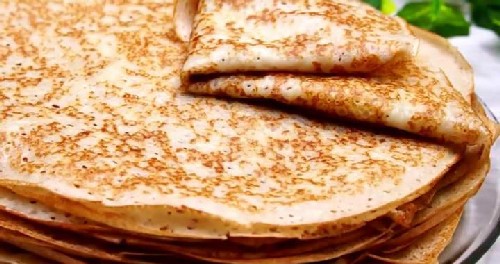 Dit recept bevat geweldige kooktechnologie. Hier worden eieren geslagen met kokend water en krullen niet op. Dankzij deze manier van brouwen zijn de pannenkoeken dicht en gemakkelijk om te draaien.