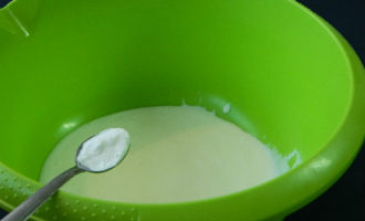 - Kefir moet warm worden gebruikt, dus eerst opwarmen in de magnetron of op het fornuis. Giet frisdrank in warme kefir en roer ritmisch. De reactie die nodig is om luchtige pannenkoeken te verkrijgen zal optreden.