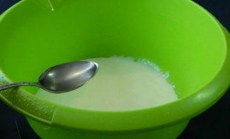 - Meng kefir op kamertemperatuur met losgeklopte eieren en kneed grondig met een lepel of vork.