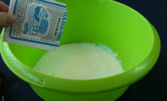 Giet ongeveer een derde van het volume kefir in een bak om het deeg te kneden en meng het met een theelepel zuiveringszout. Zet ongeveer 10 minuten opzij.