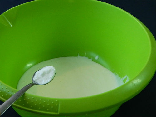 - Giet bakpoeder in kefir en meng. Je kunt dezelfde hoeveelheid bakpoeder gebruiken in plaats van bakpoeder.