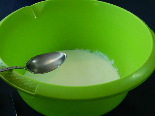 - Kefir moet warm worden gebruikt, dus eerst opwarmen in de magnetron of op het fornuis. Giet frisdrank in warme kefir en roer ritmisch. De reactie die nodig is om luchtige pannenkoeken te verkrijgen zal optreden.