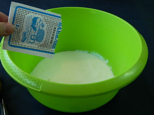 - Meng bloem met bakpoeder en zeef door een zeef tot een ei-kefirmassa. Kneed de componenten.