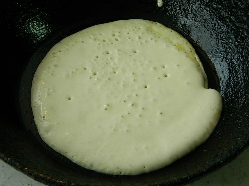 - Doe het deeg in een met olie voorverwarmde koekenpan en strijk het voorzichtig glad over het oppervlak. Dek af en bak aan de ene kant, draai dan om naar de andere en sluit het deksel weer. De pannenkoeken zijn snel genoeg gebakken en blijven luchtig als je ze uit de pan haalt.