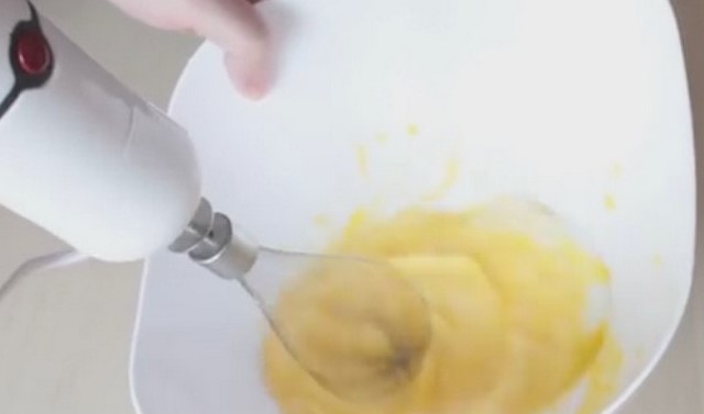 - Meng eieren met kristalsuiker. Klop met een mixer of klop tot het licht romig is.