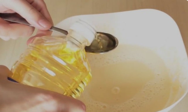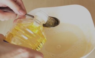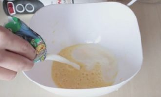 Giet een eetlepel plantaardige olie, frisdrank en breng op smaak met zout. Roer het deeg.