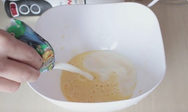 - We nemen een diepe container en breken de eieren erin, gieten dan de zure melk erin en voegen suiker toe. Meng alles goed en klop bovendien alles met een garde.