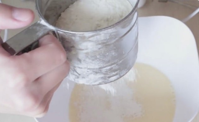 - Voeg bloem en soda gezeefd door een zeef toe aan het mengsel en kneed het pannenkoekdeeg met een garde.