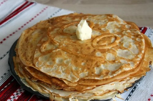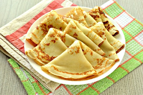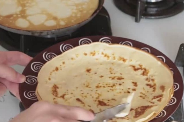 - Meng de massa. Vet de pan in met olie en verwarm. Giet een pollepel deeg in een voorverwarmde pan. We kantelen het in verschillende richtingen zodat het deeg zich over het oppervlak verspreidt. Bak de pannenkoek aan beide kanten tot hij licht begint te blozen. We zetten de pannenkoeken op een bord in een stapel. Klaar!