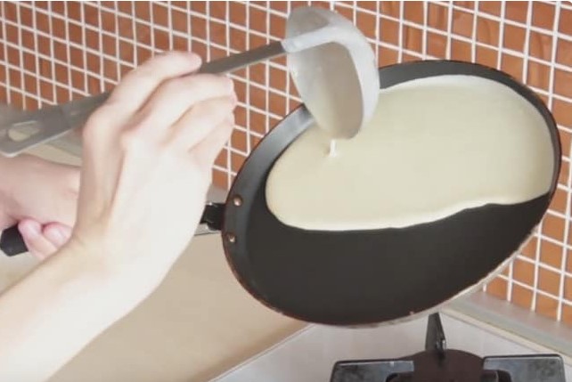 - Verwarm de pan voor, vet de bodem in met olie en giet het eerste deel van het deeg erin. Draai de pan zodat het deeg zich over het hele of het grootste deel van het oppervlak verspreidt. Pannenkoeken moeten groot en luchtig zijn.