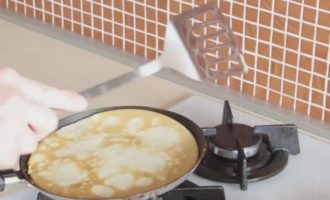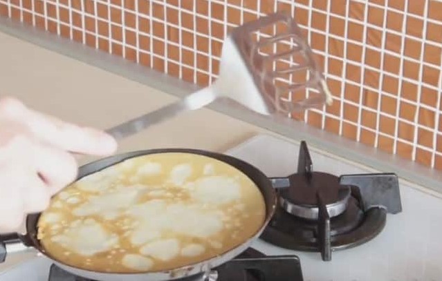 Na 2 minuten. de pannenkoek is bruin en kan worden omgedraaid naar de andere kant.