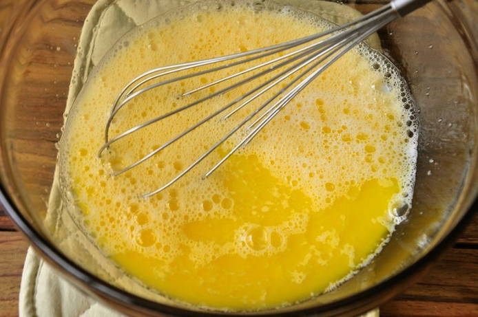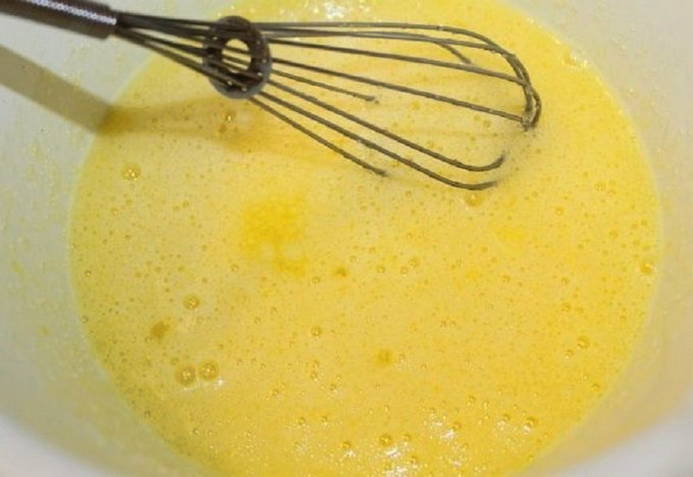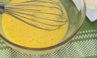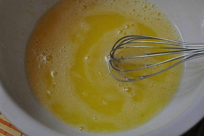 - Giet 2 eetlepels in een diepe container. water, en ook rijden in 3 eieren. Roer de vloeibare ingrediënten goed door elkaar met een garde.