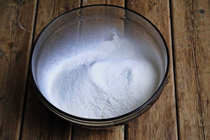 - Voeg soda, citroenzuur en kristalsuiker toe aan de bloem. Giet geleidelijk de eiermassa en warm water erbij, onder voortdurend roeren.