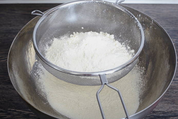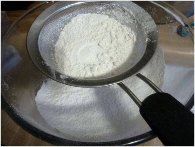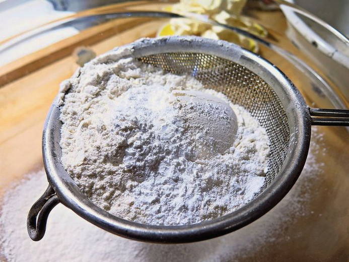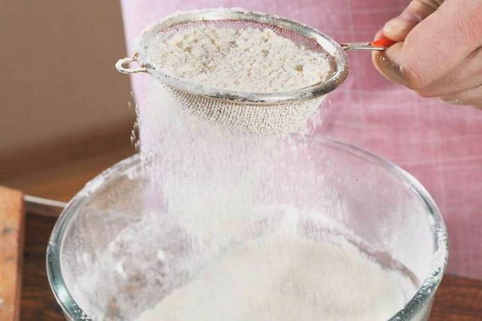- Zeef de bloem door een zeef om hem met zuurstof te vullen.