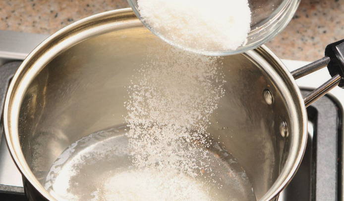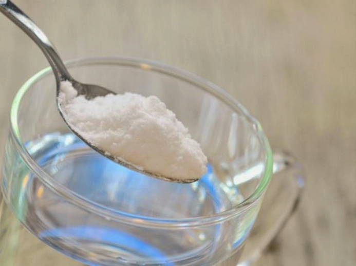 - We verwarmen het water een beetje om het warm te houden. Los daarin soda, zout en kristalsuiker op.